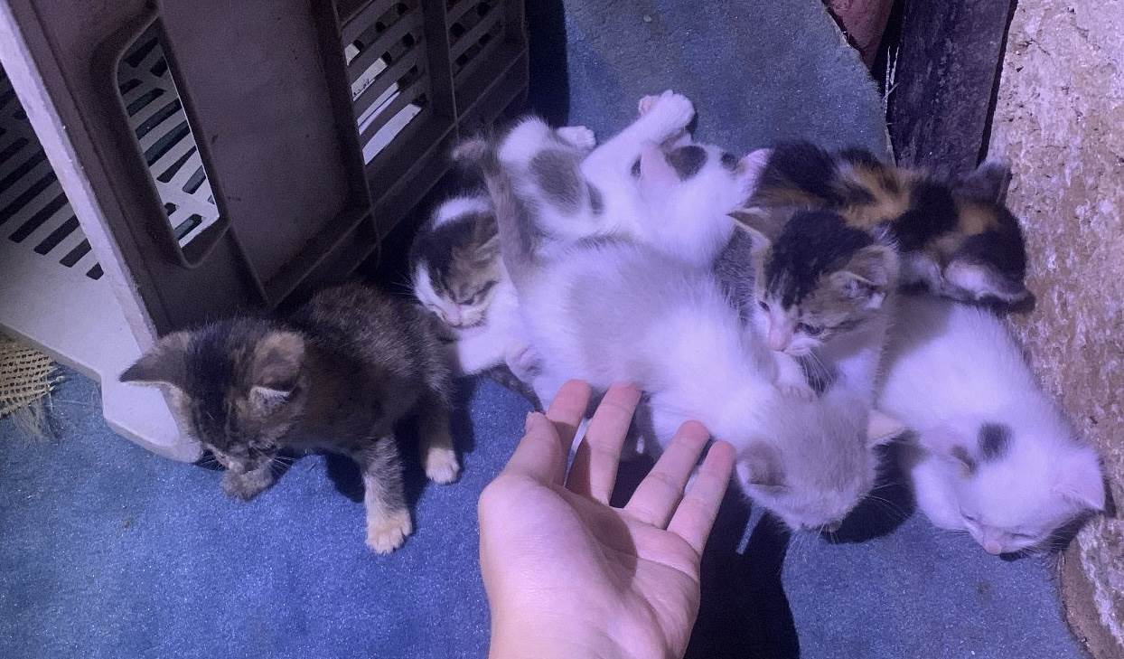 Gata adulta, de porte pequeno, com 7 filhotes de 1 mês.